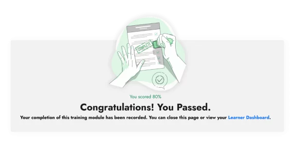 Cada módulo termina com uma pontuação baseada nos resultados do questionário. Esses resultados destacam pontos fortes, revelam vulnerabilidades e mostram que os funcionários estão concluindo o treinamento e o aprendizado de forma eficaz.