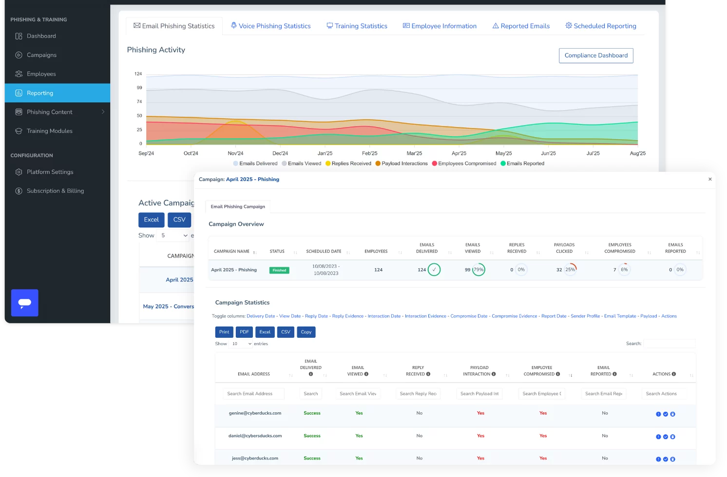 Nossa plataforma suporta simulações de phishing por e-mail conversacional, refletindo como os invasores reais criam confiança por meio de comunicação direta ao longo do tempo.